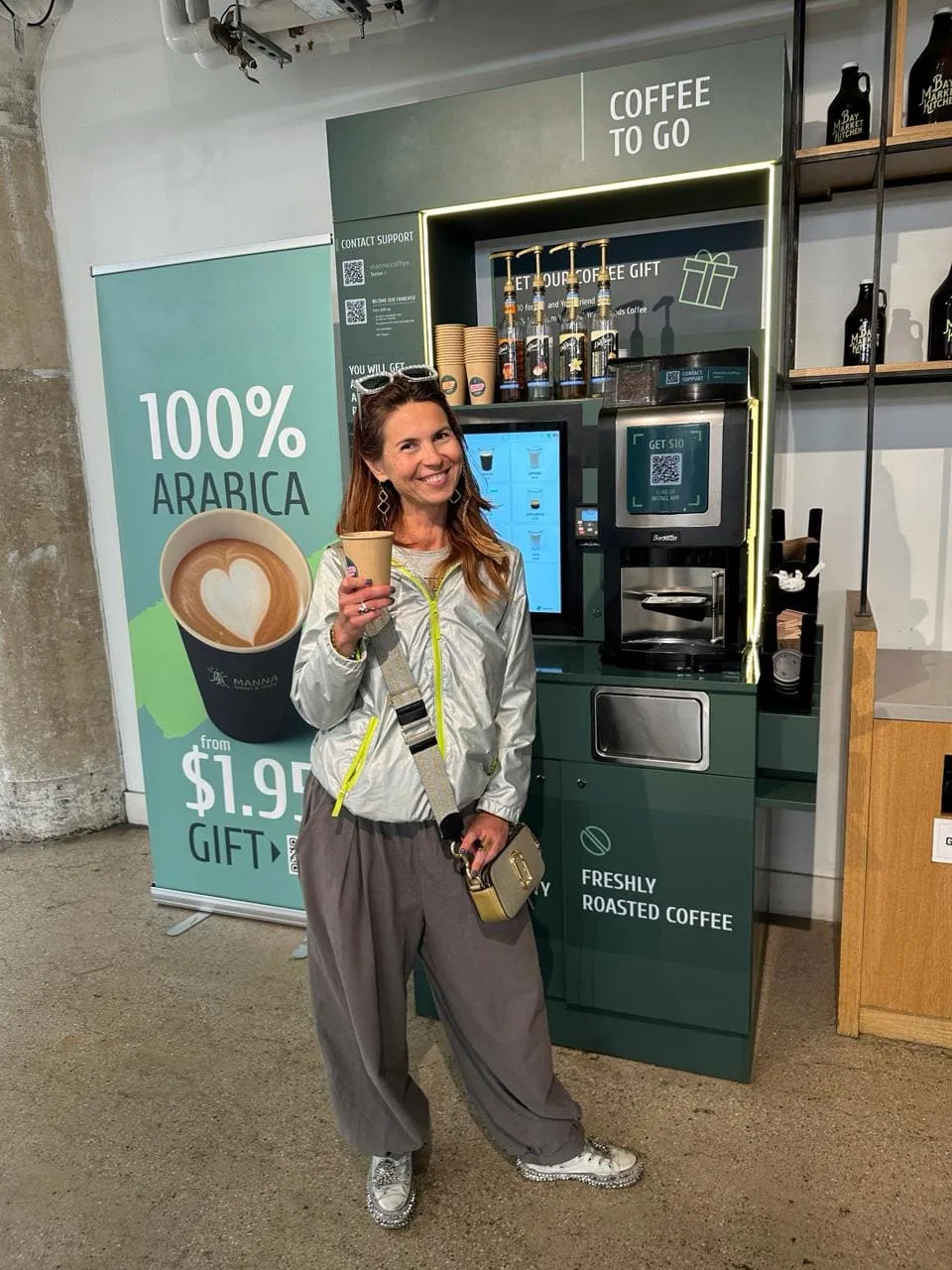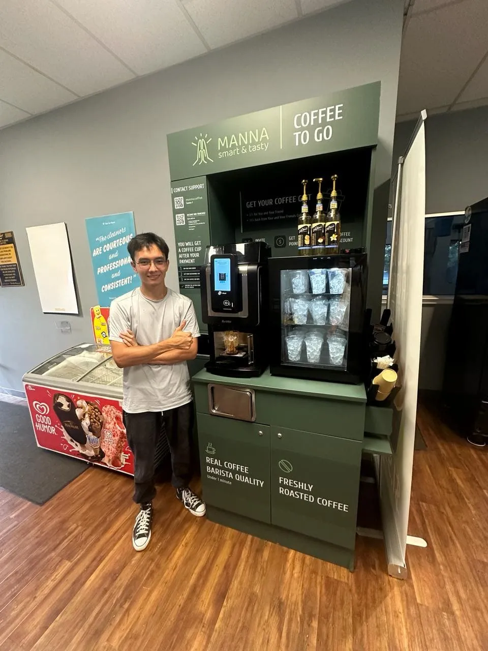 Кофейня оснащена умным микромаркетом, который позволяет дополнительно продавать свежие продукты и снеки.